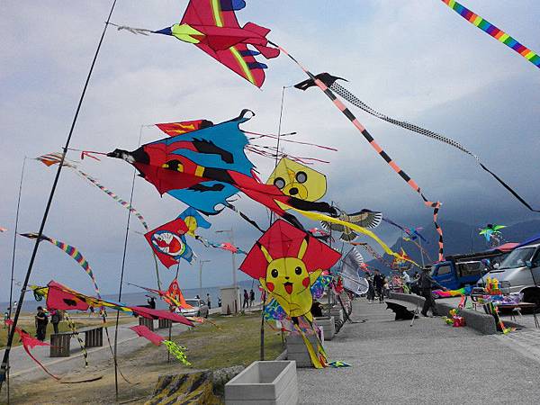 潮境公園最著名的,大概就是飛天掃帚跟大貝殼溜滑梯了。當天從望幽谷走下來後,剛好看到許多風箏隨風飛揚,上面的卡通人物好像雀躍到要飛上天了,覺得很可愛。飛天掃帚是熱門拍照景點,遊客拍得很歡樂。從低一點的地方看基隆嶼似乎更大了。